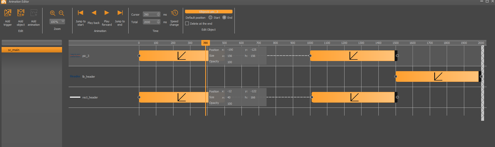 HMI Designer Animation Editor The editor makes it easy to create animations. Position, size and transparency changes are available. A touch event, a screen or a macro call can be used as trigger event.