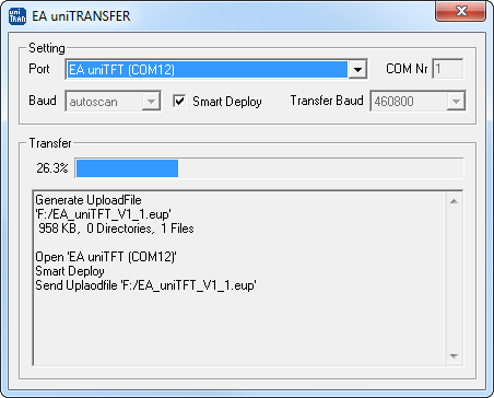 The firmware file also can be transferred to EA HMI-Series with any system. To do this, transfer the contents of the * .fw / *.eup file 1:1 (with protocol in packets) to the module. The transfer progress will become visible on the display module. After successful transfer, a data check will be done automatically. If the data is correct, the update starts automatically. Attention: Please do not switch off the module while updating.