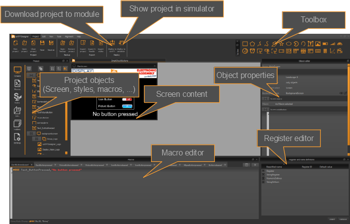 The Windows design software HMIDesigner (WYSIWYG) makes it easy to create complete screen layouts. With the help of the macro editor, functional sequences can be defined. The properties of all objects (position, size, angle) are easily adjustable. The touch functionality is also supported by HMIDesigner, so you can create radio groups, sliders, bar-graphs and simple touch-buttons. Touching a button may switch to a new screen or start a macro. An integrated simulator shows immediately the real screen including functionality. Also the digital and analogue inputs and outputs will be simulated. A comprehensive debug-function and the integrated help function round off this package.
