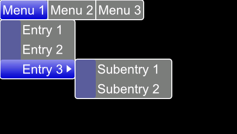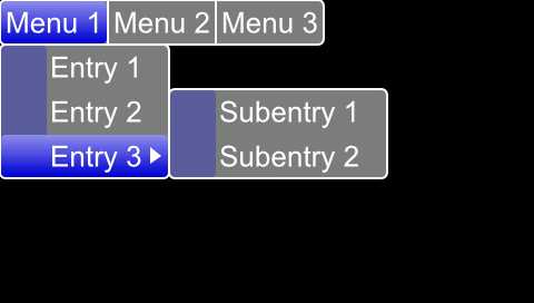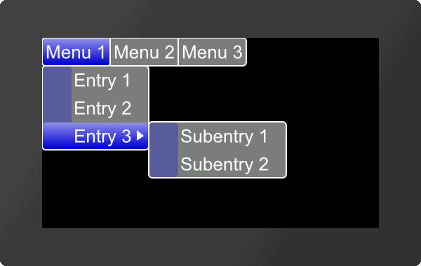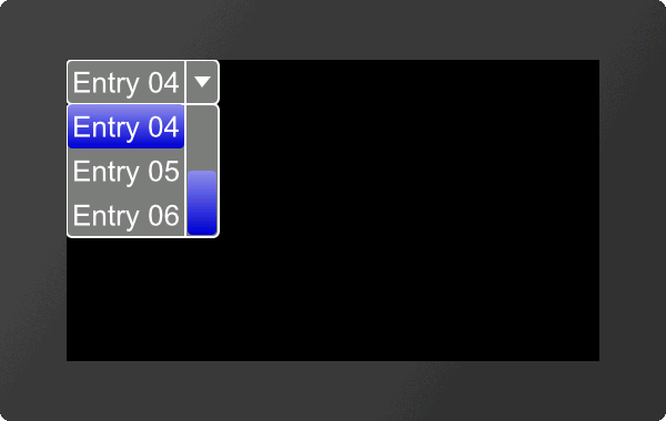 The parameter VisibleEntries defines the number of visible entries (VisibleEntries = 0: all entries visible). With the two optional parameters (BorderX and BorderY) the distance of the text to the edge of the menu can be specified. With the parameter Time the opening / closing of the ComboBox can be animated in 1/100s.