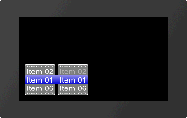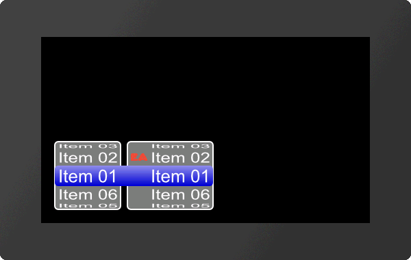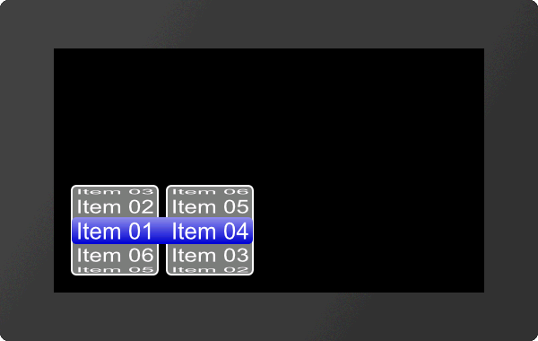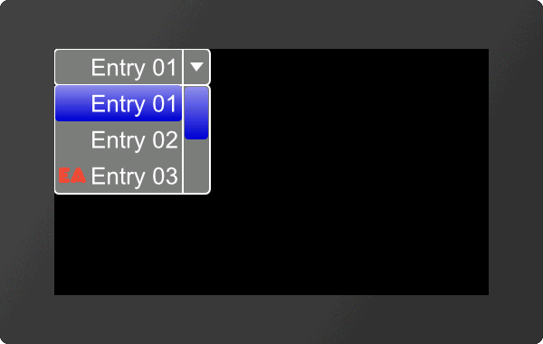 The PictureBox defined with the commands #EPSand #EPD is placed in with the given Anchor at x, y. The Radius parameter gives the corner rounding. ScrollbarWidth specifies in pixels the width of the scrollbar. The width +256 changes the position of the scrollbar to the left or top. If the value is negative, no line is present as a separator between the box and the scroll area. The VisibleEntries parameter defines the number of visible entries. The two parameters (DistanceX and DistanceY) can be used to specify the distance of the entry to the edge of the box and below the individual entries. The parameter Time can be used to define the scrolling speed to a programmatically selected new entry.
