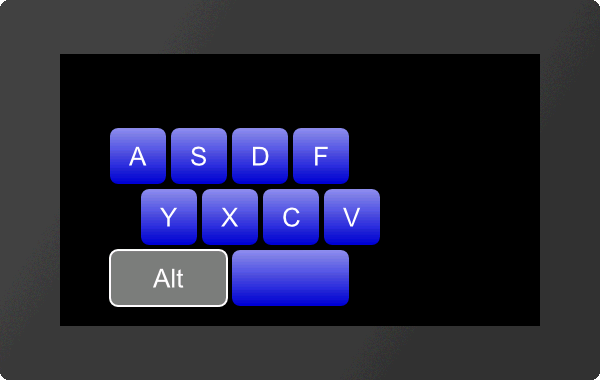 The keyboard defined with the commands #KDB and #KDS is placed at x, y with the given Anchor. The width of a key is automatically calculated from the TotalWidth or the TotalHeight and the distances between the keys (KeySpacing). If the total height or total width = 0, this length is automatically calculated from the resulting key size. The size values are the desired maximum values. The buttons are split evenly. The ButtonStyleNormal defines the style for letters and numbers, ButtonStyleSpecial applies to special keys. The last parameter (Appear) indicates whether the keyboard is displayed immediately or appears according to a defined animation (#AOA / #AOR):