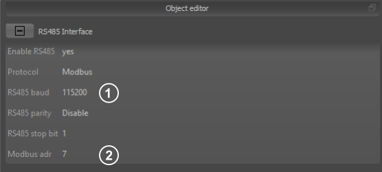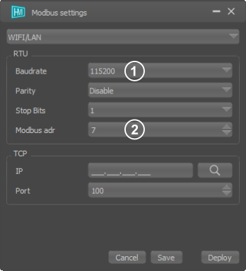 HMI DesignerDeploymentModbus RS485 (1) Baudrate 115200 (2) Modbus address 7 Project hardware settings Module interface settings Deployment settings