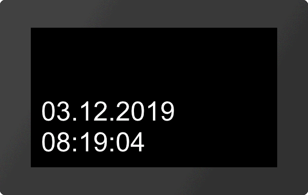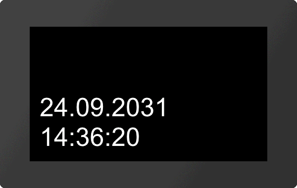 The command places a character string with date / time and the given Anchor at the position x, y. The way of presentation is based on the date format. The structure is described in more detail in the sub-chapter Date formats. If the current time is displayed, the output of the current time adapts automatically. The appearance of the character string is determined with the TextStyle (TextStyle-No.). This is explained in more detail in the subsection TextStyle.