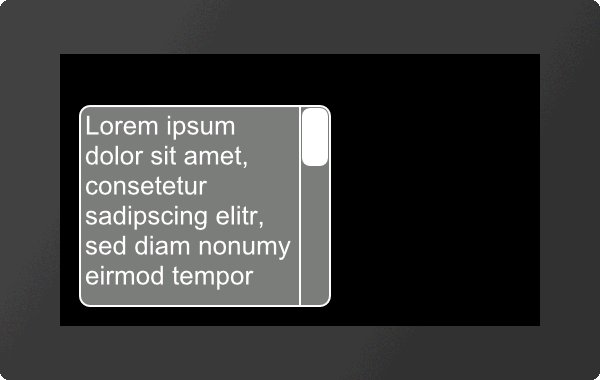 The command defines the appearance of the StringBox. Two DrawStyles are required. On the one hand the background of the EditBox and on the other hand the bar of the slider (scrollbar) is defined. The structure is described in more detail in the subsection DrawStyle. The appearance of the character string is determined with the TextStyle (TextStyle-No.). This is explained in more detail in the TextStyle subsection. With the two optional parameters (BorderX and BorderY) the distance of the text to the edge of the box can be specified. AutoWrap determines the line break: