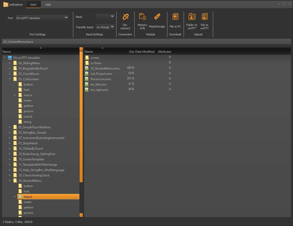 After the port settings have been selected correctly, uniTRANSFER can copy any files to the SD card. To download projects, it's sufficient to drag the project folder to the window by drag'n'drop. A progress bar in the program provides information about the status of the transmission. On the display itself further information is visible. The checkbox "Smart Deploy" can be activated to transfer files and projects as fast as possible. It compares creation time and file size between module and data source. If these are different, the file is replaced otherwise it remains and will not be copied. This saves a lot of time on large files, such as fonts or pictures. EA uniTRANSFER creates a *.eup file. This file contains all transmission data as well as commands for programming the SD card. You can also transfer the created upload file *.eup under any other system to the EA uniTFT. For this you transfer the content of the *.eup file 1:1 (with protocol in packets), no further commands are necessary. |