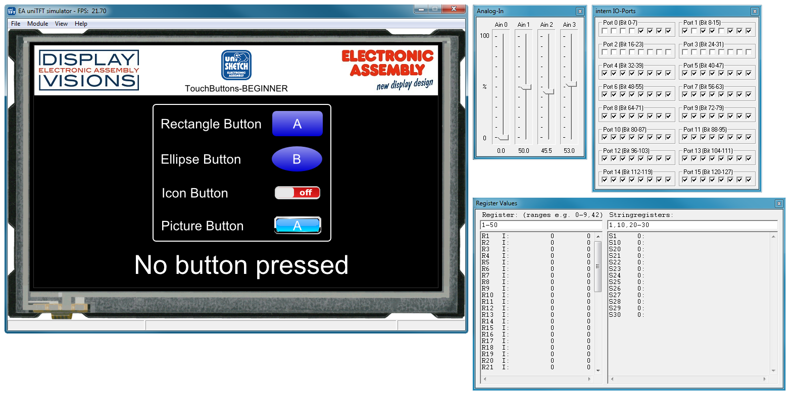 The simulator can be called directly from uniTFTDesigner (F6) and simulates behavior of the project hardware. In addition to input options such as ports and analog inputs, e.g. the computer's own RS232 interface can be used as masters RS232 or slave RS232interface. A debug function and online display of the registers facilitates the development of macro files. You can also set breakpoints and step through single lines. |