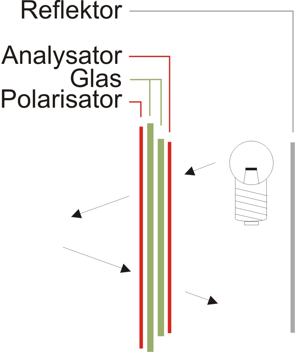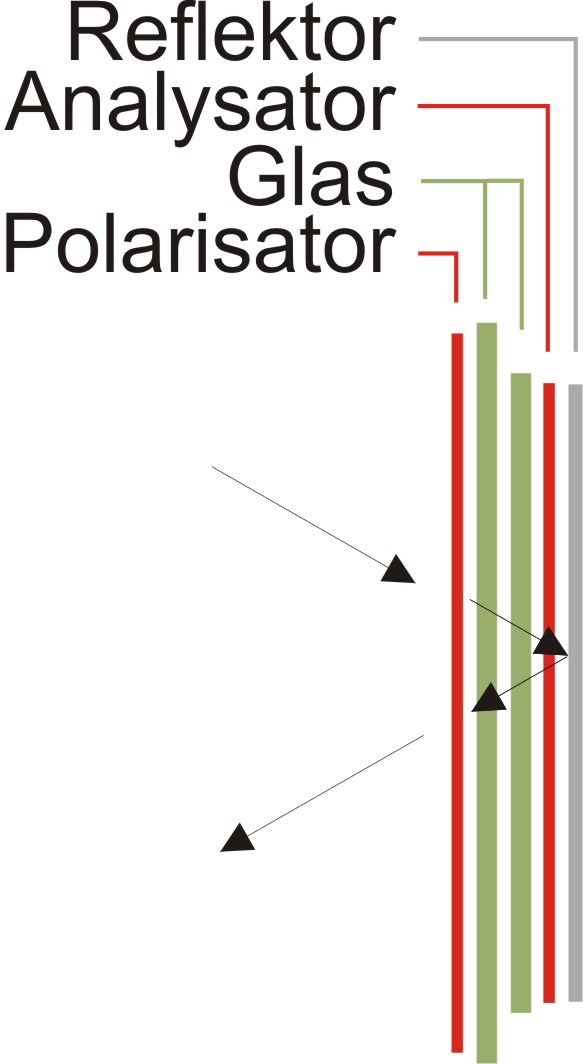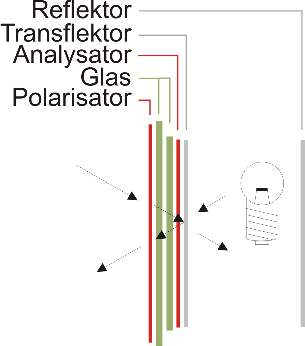 LCD est l'abréviation de Liquid Crystal Display. Un écran LCD se compose en principe de deux plaques de verre et d'un liquide spécial entre les deux. La particularité de ce liquide est qu'il fait tourner le plan de polarisation de la lumière. Cet effet est influencé par l'application d'un champ électrique. Ainsi, les deux plaques de verre sont recouvertes d'une couche métallique très fine (ITO). Pour obtenir une lumière polarisée, on colle un film polarisant, le polariseur, sur la plaque de verre supérieure. Sur la plaque de verre inférieure, il faut à nouveau placer une telle feuille, mais avec un plan de polarisation tourné de 90°. C'est ce qu'on appelle l'analyseur.